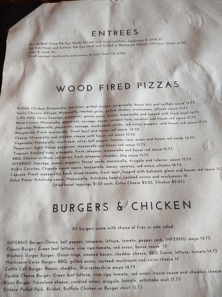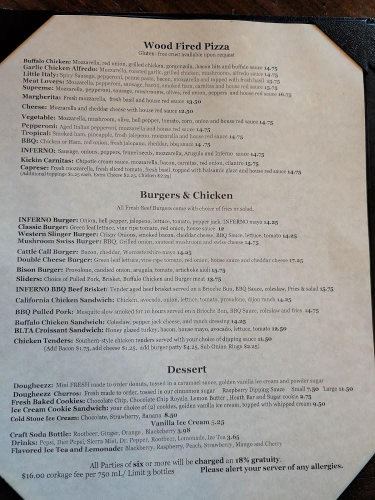 The menu at Inferno caters to a wide range of tastes. From starters like wings and hush puppies to main attractions such as bison burgers, it’s packed with options. Wood-fired pizzas bring a unique twist to classic favorites.