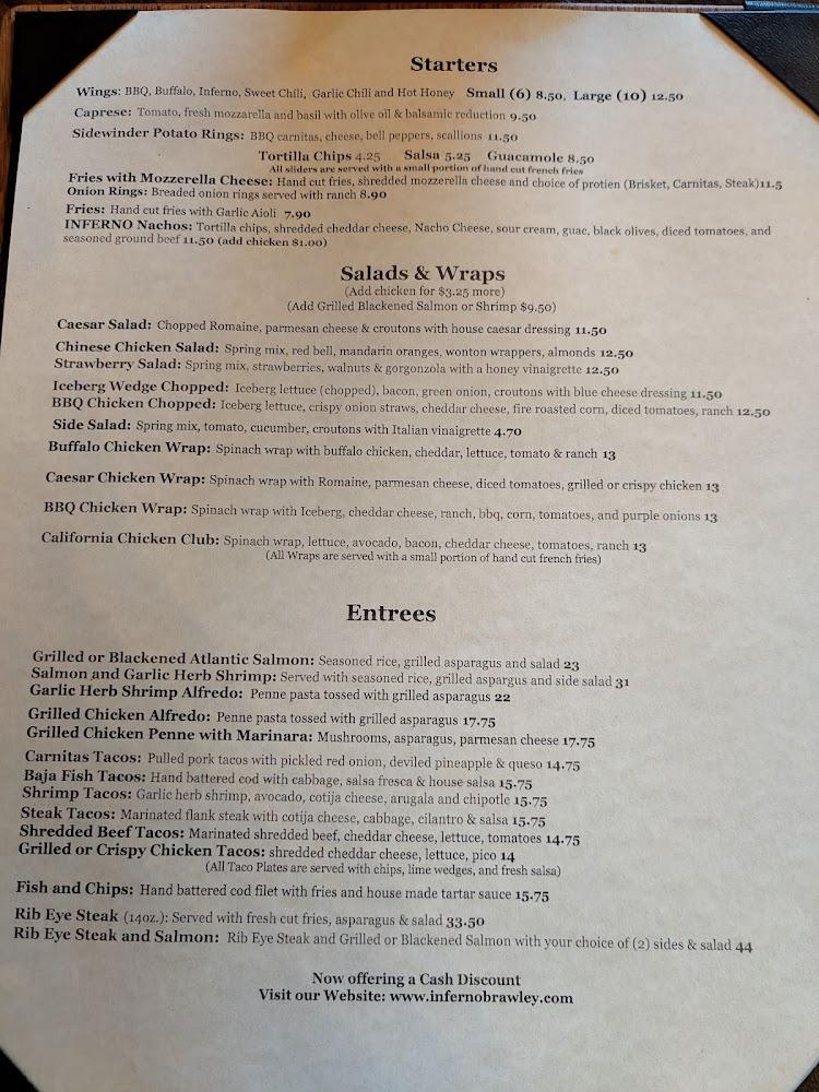 Welcome to Inferno, your go-to destination in Brawley for an unforgettable dining experience! Located at 505 Main St, our American restaurant offers a diverse menu featuring mouth-watering burgers, delicious pizzas, and local specialties, all at reasonable prices ranging from $10 to $20. Enjoy our relaxed atmosphere, perfect for solo diners and groups alike. With amenities such as a cozy terrace, contactless delivery, and a lively bar with a wide selection of beers and cocktails, you're in for a treat. Join us for lunch or dinner and experience the vibrant ambiance and quick service that make Inferno a local favorite!